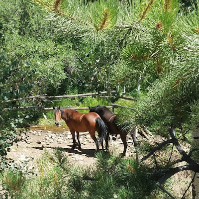 Once Bill could breathe again, we hiked up the mountain to meet Mom and Washoe with Alloy. Bill remounted to ride out, and Mom encouraged me to remount, but I refused. Alloy's frustration was also at a boiling point because of Skeeter's refusal to move and I didn't want to add any more frustration and cause another wreck.